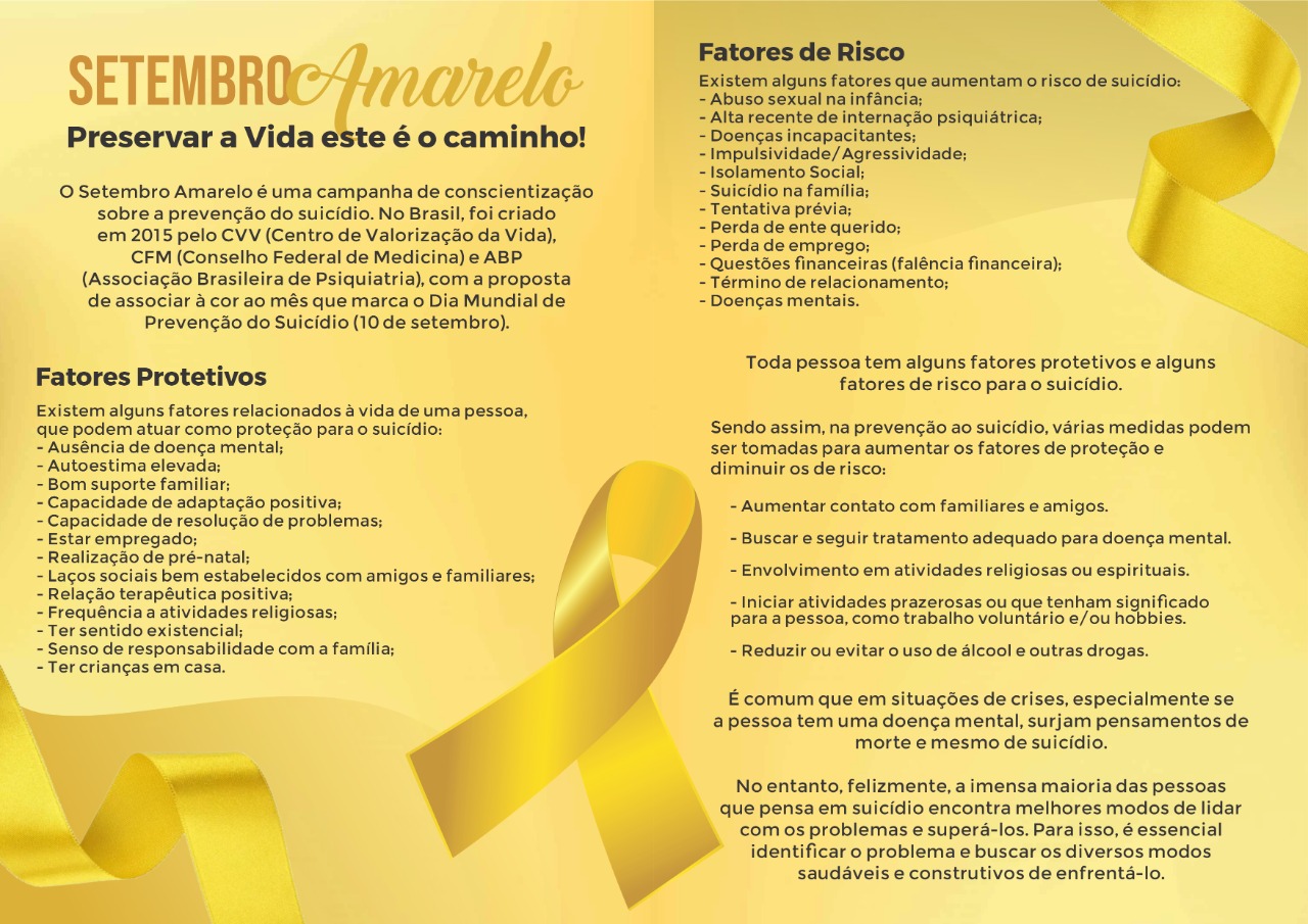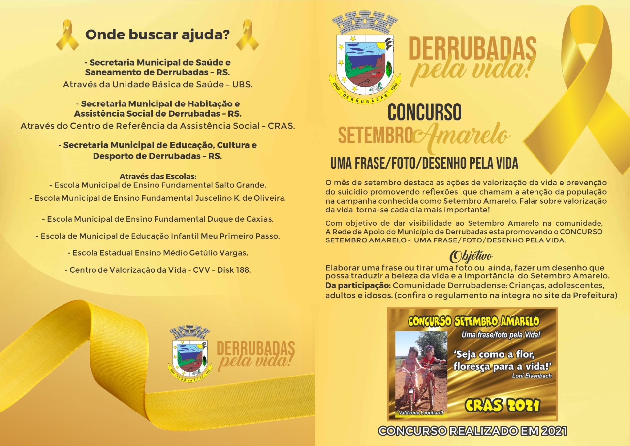 O mês de setembro destaca as ações de valorização da vida e prevenção do suicídio promovendo reflexões que chamam a atenção da população na campanha conhecida como Setembro Amarelo. Falar sobre valorização da vida torna-se cada dia mais importante! Com objetivo de dar visibilidade ao Setembro Amarelo na comunidade, A Rede de Apoio do Município de Derrubadas está promovendo o CONCURSO SETEMBRO AMARELO - UMA FRASE/FOTO/DESENHO PELA VIDA.