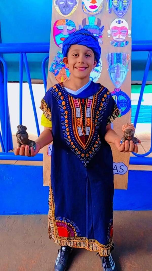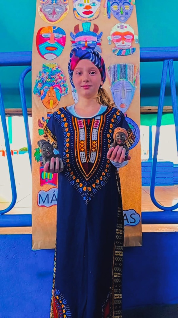 Os alunos estiveram desvendando as brincadeiras indígenas com petecas, pulseiras usando grafismo, máscaras e cerâmicas africanas. Também tiveram o privilégio de se vestir com uma Capulana (origem tsonga) que veio diretamente de Guiné Bissau. A Capulana é tecido tradicionalmente usado pelos povos de Moçambique.