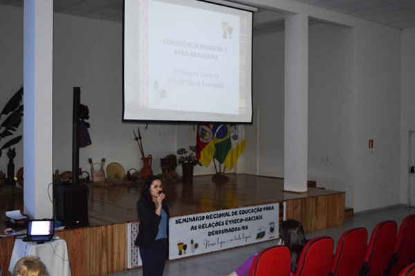 No turno da noite, a palestra ficou a cargo da Professora Dra. Rita de Cássia Fumagalli, Coordenadora Pedagógica da SMECD, que abordou aspectos sobre a construção da consciência Indígena e Afro-Brasileira no ambiente escolar. Posteriormente, os professores das escolas municipais realizaram relatos de experiências e trabalhos desenvolvidos na Rede Pública Municipal de Ensino de Derrubadas.