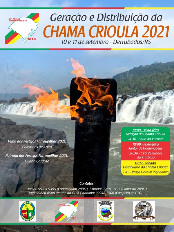 Pela primeira vez na história, o Município de Derrubadas será palco do maior simbolismo da Tradição Gaúcha, a Geração e a Distribuição da Chama Crioula, que marca todos os anos a abertura dos Festejos Farroupilhas no Rio Grande do Sul.